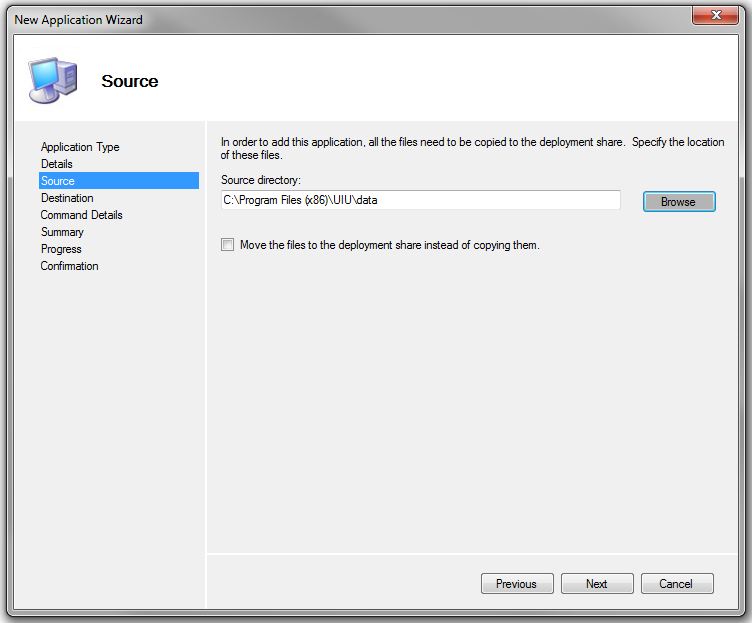 - During create application wizard, select “Application with Source Files” and browse to the installed location for the UIU Repository, (e.g. "[deployment share]\applications\uiu\data"). This creates an MDT-compatible application package with the UIU Driver Database fully extracted and ready for use. If the UIU plug-in for MDT was installed in the default location, choose that location instead, ("c:\program files (x86)\UIU\Data").